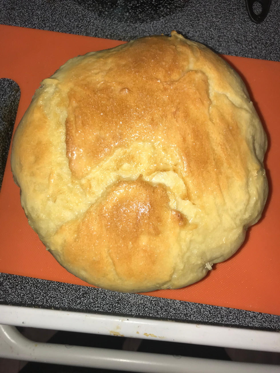 Put your round dough ball on a piece of parchment paper and carefully place it in your HOT pot from the oven. Put a lid on it and bake it for 30 min! Uncover it for 3-10 minutes until it is to your desired gold or browned top. Remove from oven and pot. Spread oil or butter over top crust and sprinkle with coarse salt. Let cook completely before eating. If any remains next day, it tastes best toasted.